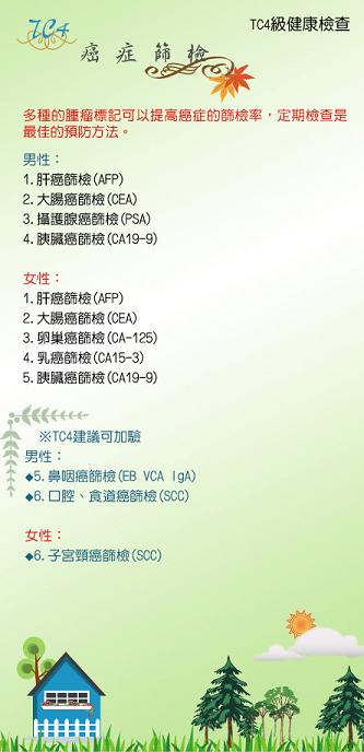 PS.目前任何腫瘤標記的篩檢意義及專一性皆不能達到100%,所以建議腫瘤標記應互相搭配檢查,提供醫師更多數據,且應進一步做物理性的直接檢查,如:內視鏡、超音波及斷層掃描...等
