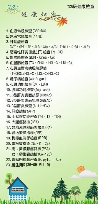 TC5級健康如意包含TC3級的完整性,甲狀腺功能檢查增加了T3的檢查項目;CRP作為體內是否有發炎現象的評估指標:電解質檢查提供腎臟用藥的參考或其他疾病的相關檢查;另外增加男女性常見癌症的腫瘤標記,如男性為攝護腺癌篩檢(PSA),女性則卵巢癌篩檢(CA-125)。